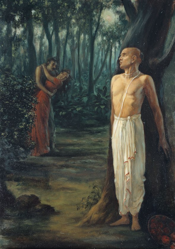 Assim, após ver um homem abraçando uma jovem mulher e fazendo praticamente tudo o que se exige da vida sexual, mesmo um brahmana plenamente qualificado não pôde controlar seus desejos luxuriosos. Não exatamente qualificado; se o fosse, não teria caído. Ele, em verdade, estava no estágio neófito. Se estou no estágio neófito, caso eu veja alguém se entregando a atividades luxuriosas ou sexuais, naturalmente meu desejo sexual também desperta, e eu naturalmente me inclino a isso. Ajamila era um praticante, ainda exercitando sama, dama, satyam, saucam… Essas são as qualificações de um brahmana. Sama significa ter a mente equilibrada, livre de perturbações e de qualquer ansiedade. Dama quer dizer controle dos próprios sentidos. Satyam significa que você não deve comprometer a verdade por algum interesse pessoal. Saucam, por sua vez, significa ser limpo, interna e externamente.