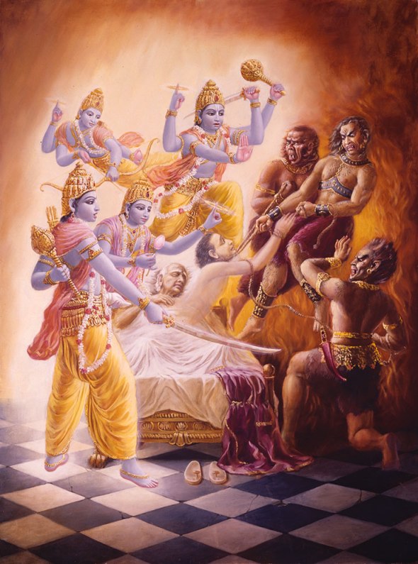 Embora os servos de Yamaraja tenham dentro de sua jurisdição todos os seres vivos envolvidos com pecados, os mensageiros de Vishnu são capazes de punir até mesmo o próprio Yamaraja caso ele cometa alguma espécie de injustiça com um devoto de Vishnu, o Senhor Supremo.