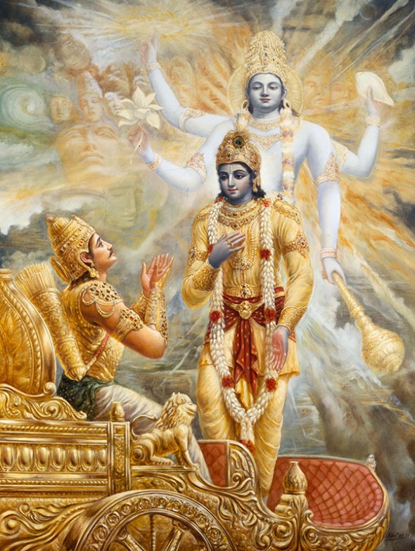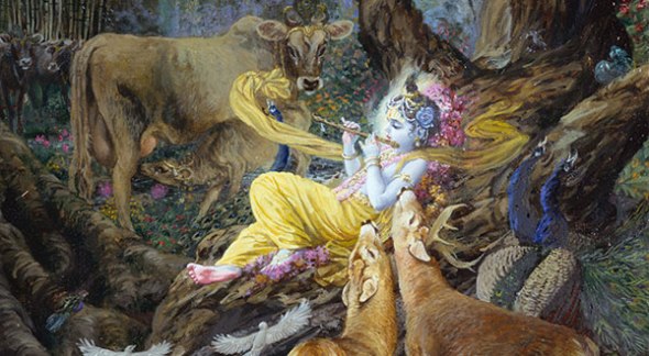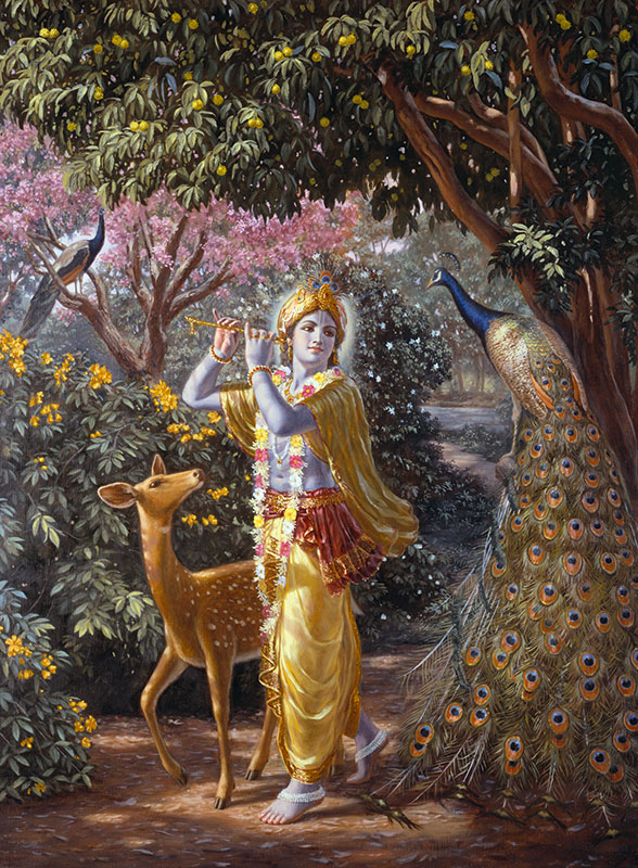“Sua tez era azul escuro e Sua vestimenta dourada. Usando uma pena de pavão, minerais coloridos, raminhos de botões de flores e uma guirlanda de flores silvestres e folhas, Ele estava vestido exatamente como um dançarino teatral. Ele descansava uma mão sobre o ombro de um amigo, e com a outra, girava um lótus. Lírios adornavam Suas orelhas, Seu cabelo passava por sobre Suas bochechas, e Seu rosto de lótus estava sorrindo!” (Srimad-Bhagavatam 10.23.22)