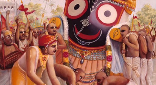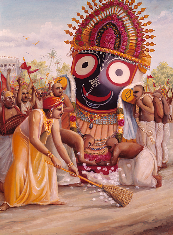 O dia do festival finalmente chegara, e esse dia é marcado pelo ato de humildade de o rei varrer a rua pela qual o Senhor Jagannatha desfila. Quando Mahaprabhu viu isso, Ele ficou ainda mais favoravelmente inclinado ao rei, e, com aquilo em mente, seguiu cantando e dançando em grande êxtase em frente ao majestoso carro do Senhor Jagannatha. Em um momento, Seu transe místico foi tão elevado que chegou próximo a desmaiar. Por Seu arranjo divino, Ele permitiu que Prataparudra estivesse bem ao seu lado para segurá-lO em seus braços. O toque do rei, todavia, fez com que Mahaprabhu recobrasse Seus sentidos, ao que Ele começou a Se censurar por ter tocado uma pessoa mundana. O Chaitanya-charitamrita traz-nos a informação de que o Senhor Chaitanya desfrutava interiormente de Sua associação com o rei, mas precisava, externamente, estabelecer exemplo para os demais na ordem de vida renunciada.