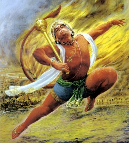 Foto: Hanuman incendeia o reino de Ravana a serviço de Rama.