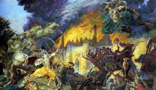 Foto: Rama mata Ravana e seu exército. Ao fundo, o reino de Ravana em chamas.
