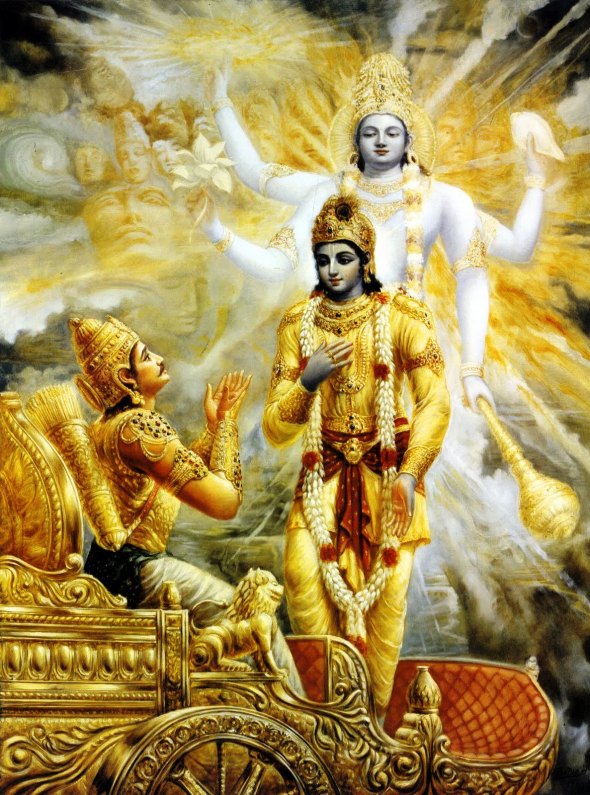 Krishna dota Arjuna com olhos divinos para ver essa exibição nunca vista anteriormente. Uma visão deslumbrante oprime Arjuna subitamente. A brilhante e poderosa irradiação o assusta, pois ameaça queimar toda a criação. Arjuna fica aterrorizado quando a boca da forma universal, a onipotente paixão da morte, consome os guerreiros reunidos ali e todos os demais. Arjuna grita: “Quem é Você?” A resposta do Senhor Krishna (verso 11.32) é o famoso verso da Bhagavad-gita, citado pelo cientista Robert Oppenheimer, enquanto observava a explosão da primeira bomba atômica nos desertos do Novo México: “Eu sou o tempo, o grande destruidor dos mundos…”