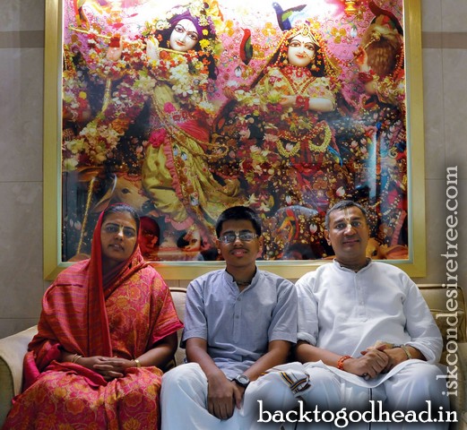 Eu o ouvi pacientemente, mas não me senti tentado. Eu agora estava profundamente ligado aos devotos e ao modo de vida consciente de Krishna. Meus ganhos eram suficientes para manter minha família contente. Minha esposa, Tulasi Devi Dasi, e meu filho, Raghunatha, apoiavam meus valores e práticas espirituais conscientes de Krishna e abominavam a busca impulsiva de riquezas por mera ganância. Saí da reunião tranquilo, mas desapontado com minha incapacidade de convencer meu amigo a abandonar seus caminhos perigosos.