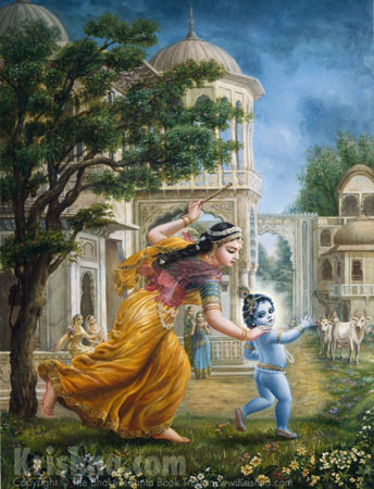 Mãe Yashoda viu que Krishna olhava de um lado para o outro com medo dela, porque sabia que estava agindo errado. Ao ver seu filho tão absorto, ela silenciosamente se aproximou dEle por trás. Krishna, porém, vendo que ela vinha em Sua direção com uma vara na mão, desceu imediatamente do pilão e começou a fugir amedrontado. Mãe Yashoda perseguiu-O em todos os cantos tentando capturar a Suprema Personalidade de Deus, que nem as meditações dos grandes yogis podem alcançar. Em outras palavras, a Suprema Personalidade de Deus, Krishna, a quem jamais alcançam os yogis e especuladores, estava brincando como uma criança pequena com uma devota tão elevada como mãe Yashoda. Mãe Yashoda, porém, não podia pegar facilmente o menino que corria, por causa de sua cintura fina e corpo pesado. Mesmo assim, ela tentava persegui-lO tão rápido quanto possível.