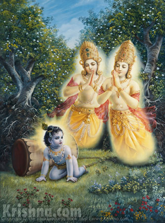 Embora estivesse amarrado ao pilão de madeira, o menino Krishna começou a engatinhar em direção às árvores gêmeas a fim de realizar a profecia de Seu grande devoto Narada. O Senhor Krishna sabia que Narada era Seu grande devoto e que as árvores que se erguiam diante dEle como duas árvores gêmeas arjuna eram, de fato, os filhos de Kuvera. “Devo agora cumprir as palavras de Meu grande devoto Narada”, pensou. Então Ele começou a avançar através do espaço entre as duas árvores. Embora Krishna fosse capaz de atravessar a passagem, o grande pilão de madeira prendeu-se horizontalmente entre as duas árvores. Aproveitando-Se disso, o Senhor Krishna começou a puxar a corda amarrada ao pilão com muita força. Logo que Ele puxou, as duas árvores, com todos os galhos e membros, caíram imediatamente fazendo um grande estrando. Das duas árvores quebradas caídas, saíram duas grandes entidades brilhantes como o fogo ardente. Todas as direções ficaram iluminadas e belas devido à presença deles. Os dois corpos purificados se apresentaram imediatamente ao menino Krishna e inclinaram-se para oferecer seus respeitos e orações com as seguintes palavras: