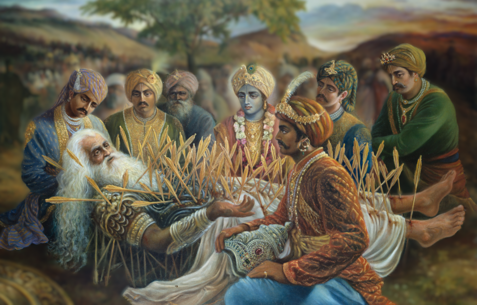 Em poucos momentos, tanto os Pandavas quanto os Kauravas se reuniram em torno de seu avô caído. Todos eles estavam perto das lágrimas. Mesmo o perverso Duryodhana estava angustiado – ele tinha acabado de perder não apenas o comandante de seu exército, mas também seu avô, que sempre fora gentil com ele, mesmo quando eles discordavam fortemente sobre muitas coisas.