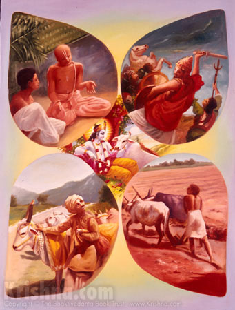 No Bhagavad-gita, Krsna diz que os brahmanas – os homens mais inteligentes, que estão interessados em conhecimento transcendental e filosofia – deveriam receber os postos mais elevados, e, sob suas instruções, os ksatriyas deveriam trabalhar. Os administradores devem certificar-se de que há lei e ordem e que todos estão cumprindo seu dever. A próxima seção é a classe produtiva, os vaisyas, que se ocupam em agricultura e proteção às vacas. E, finalmente, há os sudras, os trabalhadores comuns que ajudam as outras seções. Isto é a civilização védica: pessoas vivendo de maneira simples com base na agricultura e na proteção às vacas. Se você tem leite, grãos, frutas e legumes o suficiente, você pode viver muito bem.